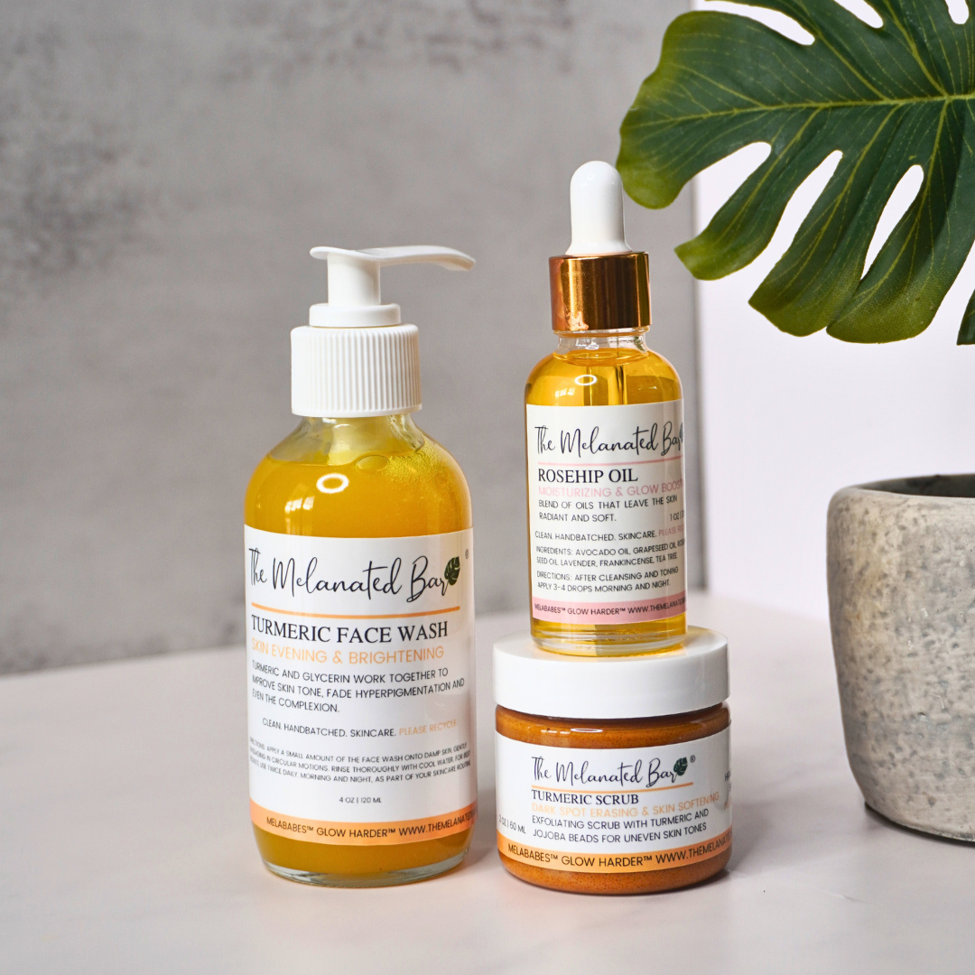 - Turmeric Face Bar (3.5 oz) or Turmeric Face Wash (4 oz) – Cleanses deeply while prepping your skin for the glow-up